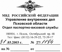 Статья «Права человека аннулированы», опубликованная в газете «Псковская губерния» 26 марта 2003 года, в отделе паспортно-визовой службы УВД Псковской области рассмотрена.