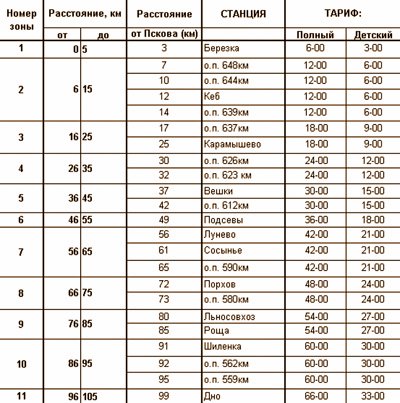Таблица стоимости проезда пассажиров в поездах пригородного сообщения по зонному тарифу по маршруту Псков - Дно